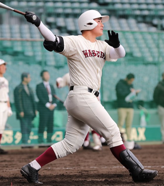 早実は1回戦の明徳義塾高戦に延長10回、5対4で勝利。清宮は4打数1安打/写真は甲子園練習
