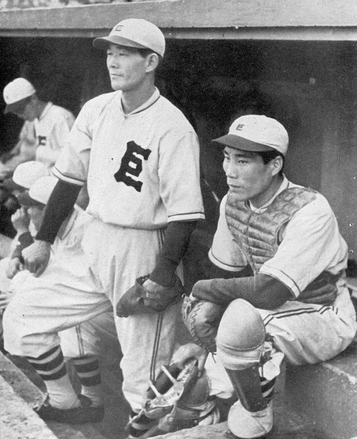 1941年の沢村(左)と吉原。胸には「巨」の漢字が入った