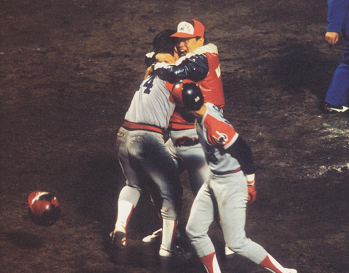 古川慎一と交錯。古川を押し出すような形となり、そのままベースを離れた古川にタッチ。審判はアウトを宣告したが、すぐさま有藤監督が飛び出し、審判団に猛抗議し、これが長引く。ただ、すでに試合時間は3時間30分を超えていた。近鉄にとっては1分1秒が惜しい。