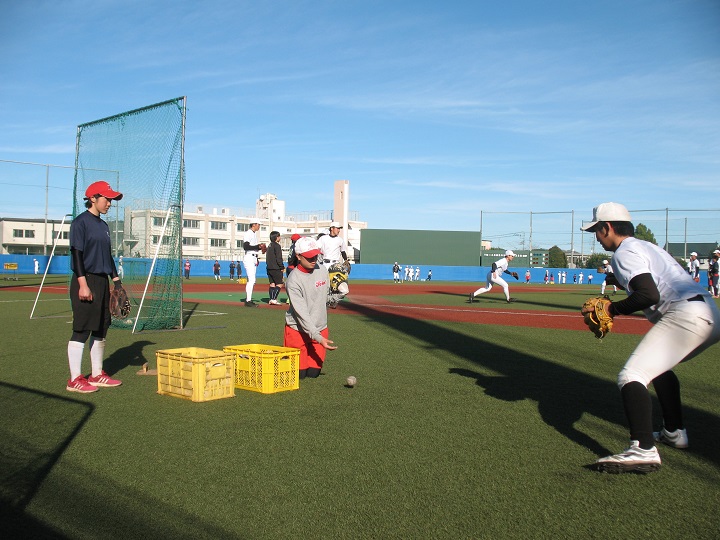 硬式球よりも大きいソフトボールを使用しての内野ノックに、野球部員は悪戦苦闘。また、硬式球でのノックでも、女子部員は軽快なグラブさばきを見せていた。