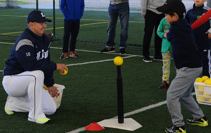 子どもたちに笑顔でティーバッティングを教える西武・森