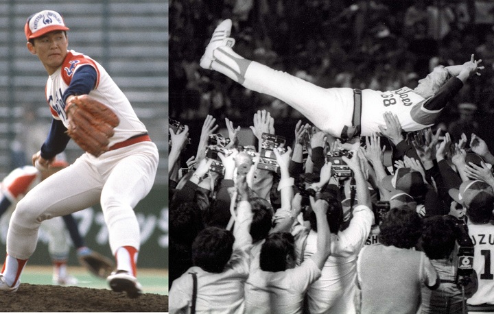 メキメキと力をつけた久保康生(右)。西本監督のラストゲーム・81年10月4日の近鉄対阪急の試合でも登板し、試合後には名将を胴上げした(左)