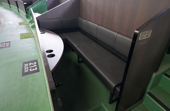 そしてネット裏上段の一塁側、三塁側に残っていた緑色の旧シートは「ネット裏指定席」にリニューアルし、こちらも黒が基調の高級感あふれるシートに変身。周囲の席に比べるとややコンパクトながら背面と座面にクッションがついており、高い位置から試合をゆったりと見ることのできる席だ。