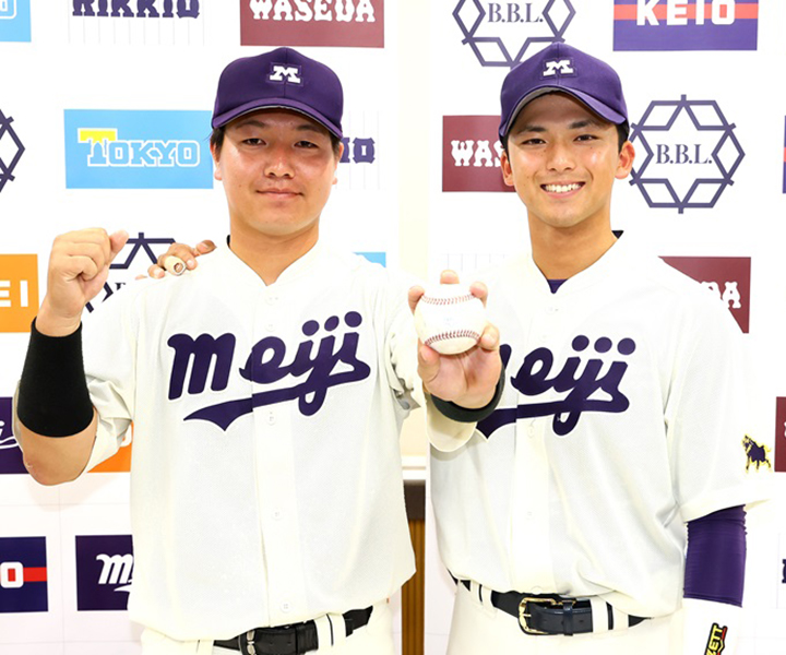 明大は逆転勝利でV戦線に踏みとどまった。決勝2ランの副将・中山[左]はホームランボールを手にし、主将・宗山[右]と笑顔を見せる[写真=菅原淳]