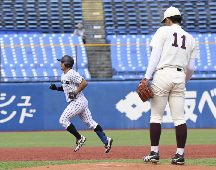 立大・桑垣は1回表に先頭打者本塁打。三塁ベースを回ると、自校の三塁ベンチへ向かってガッツポーズを見せた[写真=矢野寿明]
