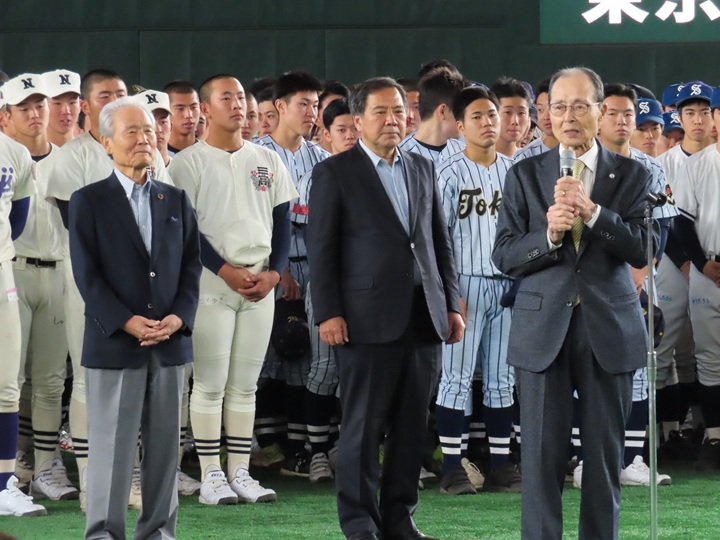 「キッズファーストアクション in東京ドーム」の特別ゲストとして球心会・王代表があいさつした。後方左からNPB・榊原コミッショナー、日本高野連・寶会長[写真=BBM]