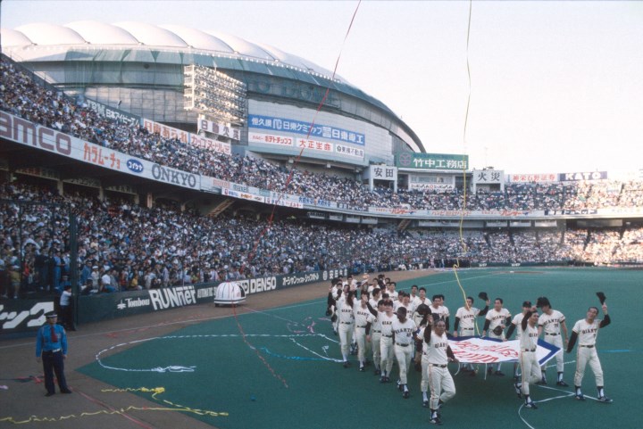 87年、後楽園での巨人の優勝セレモニー。後方に見えるのが建設中の東京ドームです