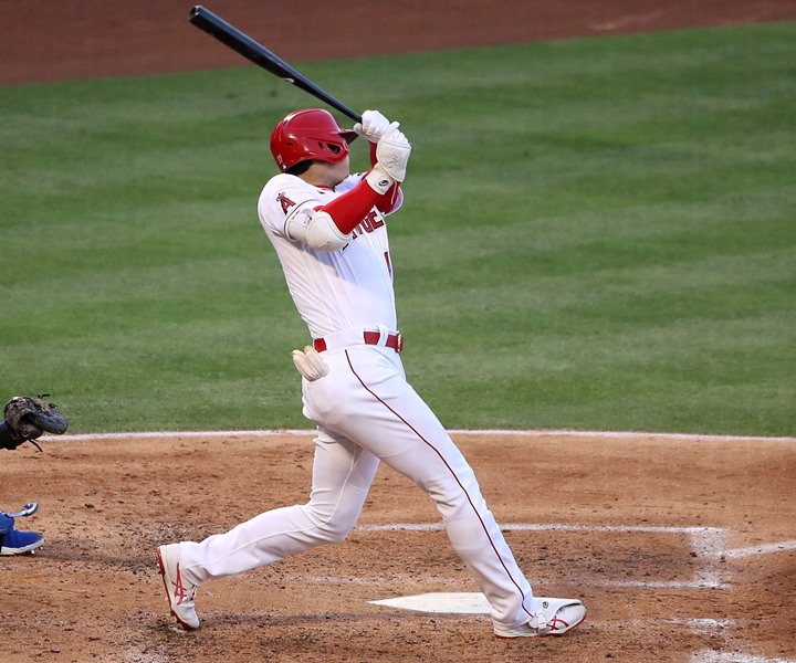 6月9日[日本時間]のロイヤルズ戦で、自身最長飛距離とも言われるホームランを打った大谷[エンゼルス]。打つときに上体を反るようにしているのがポイントだと思います[写真/GettyImages]