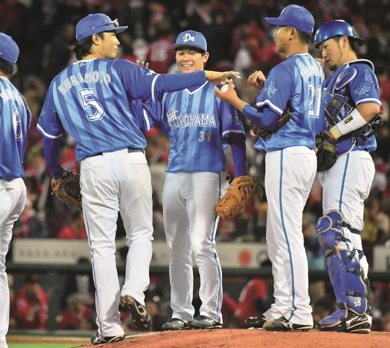 4月19日の広島戦[マツダ広島]で初完封勝利を飾り、倉本寿彦からウイニングボールを受け取る今永。先発投手として最高の瞬間でしょう!/写真=佐藤真一