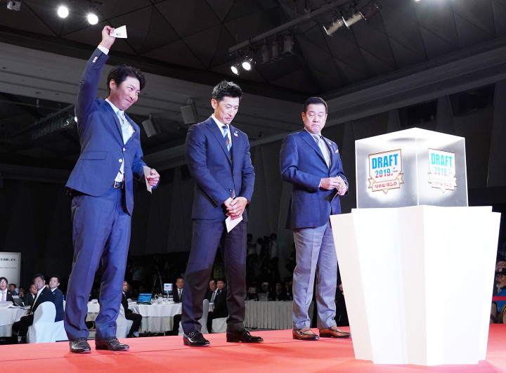 奥川の交渉権をヤクルトの高津臣吾新監督が引き当てガッツポーズ。右端の原監督の顔が渋い