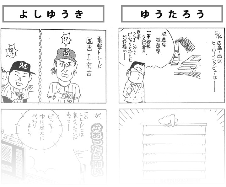 やく「両方の『よしゆうき』を秘密裡に使い分ける、これぞ『裏・二刀流』!?」 担当「『よしゆうきvsにしゆうき』が見てみたいな〜(笑)」 PROFILE やくみつる●1959年3月12日生まれ。代表作に「パロ野球ニュース」「やくみつるのガタガタ言うゾ!」「やくみつるのマナ板紳士録」「やくみつるの平成ポテンショット」など多数。本誌連載のほかにも、コメンテーターとしても幅広く活躍中。
