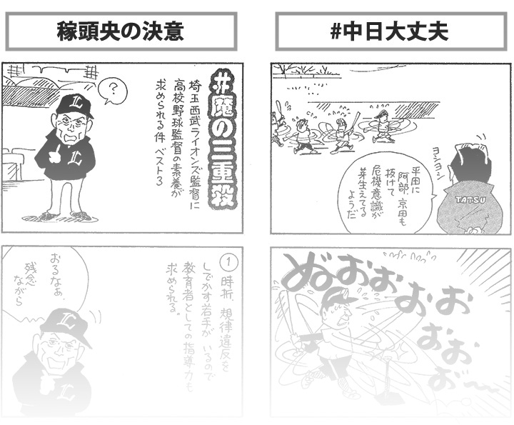 やく「FAを『卒業』という球団もあるらしいからなぁ」 担当「出会いがあれば別れもあり。それにしてもライオンズは『卒業生』が多いなぁ」 PROFILE やくみつる●1959年3月12日生まれ。代表作に「パロ野球ニュース」「やくみつるのガタガタ言うゾ!」「やくみつるのマナ板紳士録」「やくみつるの平成ポテンショット」など多数。本誌連載のほかにも、コメンテーターとしても幅広く活躍中。