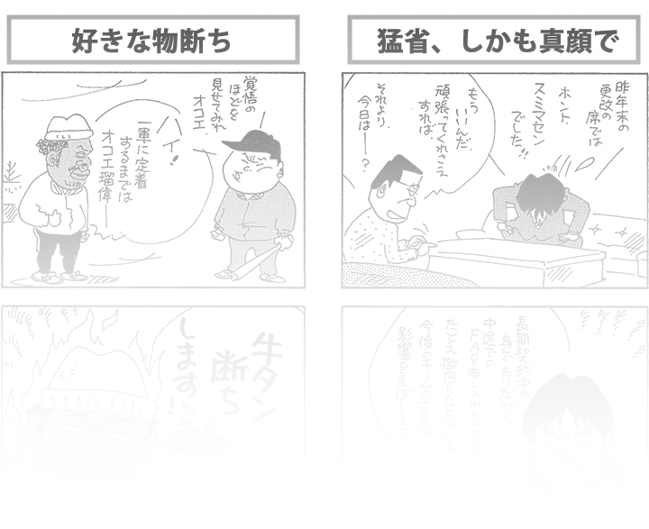 やく「ちなみに私はここゾのときは大好物のモンブラン断ちを宣します」 担当「正月太りで体が重い……。私は断つのではなく量を調整しようと思います」 PROFILE やくみつる●1959年3月12日生まれ。代表作に「パロ野球ニュース」「やくみつるのガタガタ言うゾ!」「やくみつるのマナ板紳士録」「やくみつるの平成ポテンショット」など多数。本誌連載のほかにも、コメンテーターとしても幅広く活躍中。
