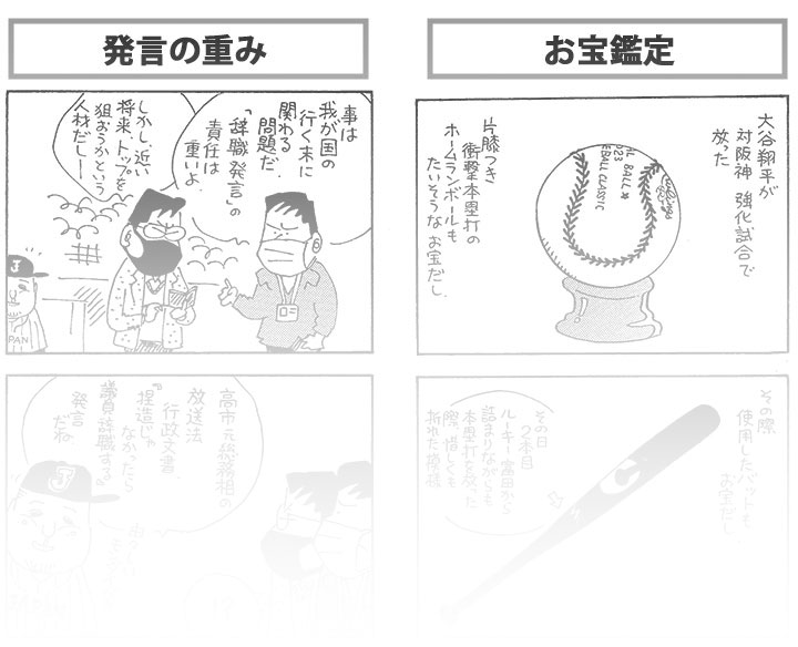 やく「強化試合最終戦で開眼したアグー、現役続行でヨカッタ!」 担当「どすこいパフォーマンスがまだまだ見られそうで一安心」 PROFILE やくみつる●1959年3月12日生まれ。代表作に「パロ野球ニュース」「やくみつるのガタガタ言うゾ!」「やくみつるのマナ板紳士録」「やくみつるの平成ポテンショット」など多数。本誌連載のほかにも、コメンテーターとしても幅広く活躍中。