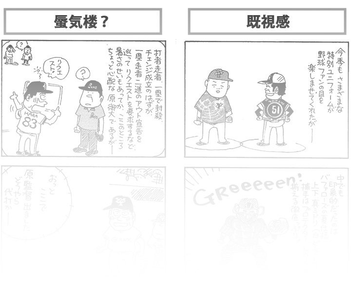 やく「来季トーキョー・ジャイアンツ入りへの布石か」 担当「帰ってくるのならベイスターズ一択でお願いします」 PROFILE やくみつる●1959年3月12日生まれ。代表作に「パロ野球ニュース」「やくみつるのガタガタ言うゾ!」「やくみつるのマナ板紳士録」「やくみつるの平成ポテンショット」など多数。本誌連載のほかにも、コメンテーターとしても幅広く活躍中。