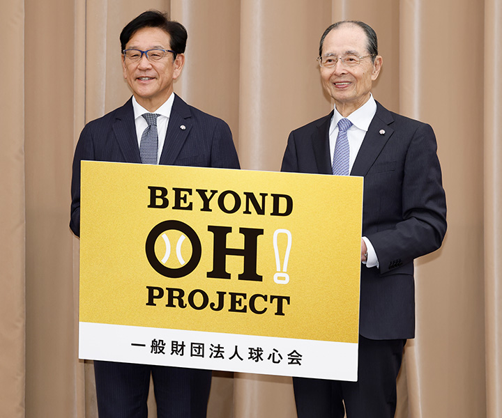子どもたちに夢と希望を与える未来をつくるため、ホークスの王貞治会長[写真右]が野球振興事業に取り組む『球心会』を設立。副代表を務めるファイターズの栗山英樹CBO[左]とともに女子の野球を普及、発展も期待される[写真=田中慎一郎]